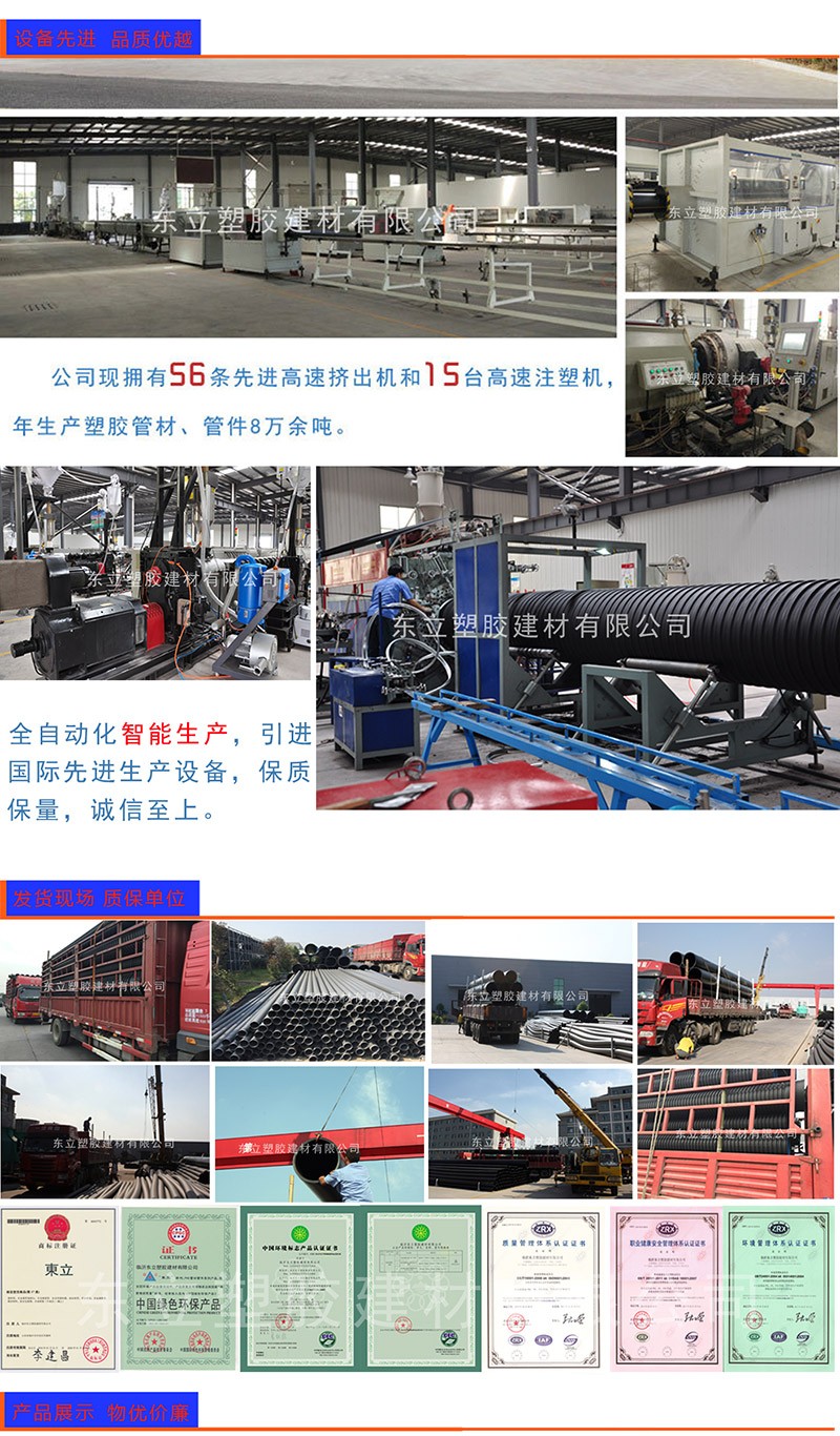PE管采用目前世界上最先進的技術(shù)生產(chǎn)制造的,具有高速擠出成型,熔融適度,自動定尺切割,PLC控制生產(chǎn)全過程的先進性能。